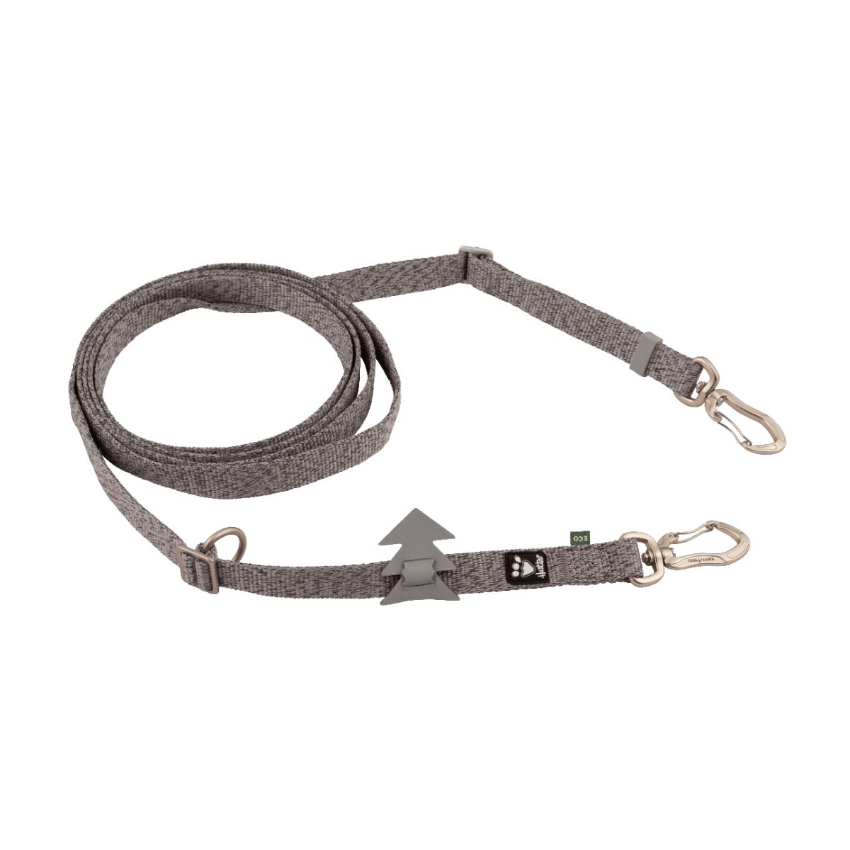 The new Hurtta leash is a true innovation: it's a multifunctional dog leash made from recycled materials that you won't want to part with! Its adjustable length and double ring allow you to wear it over your shoulder or around your waist during outdoor activities. It can be shortened from a 3m long leash to a 1m lead, or even used to walk two dogs simultaneously. Its unique design provides various uses such as walking, hiking, running, and more. The front attachment ring can be secured to a harness for an anti-pull effect. The outer material is soft, lightweight, yet highly durable and strong. The leash clips at both ends are now made from very sturdy and ultra-light aluminum, ensuring long-lasting durability. A removable reflective pattern is included for safety during low-light conditions. This hands-free leash is crafted from 100% recycled polyester, combining strength and eco-friendliness.